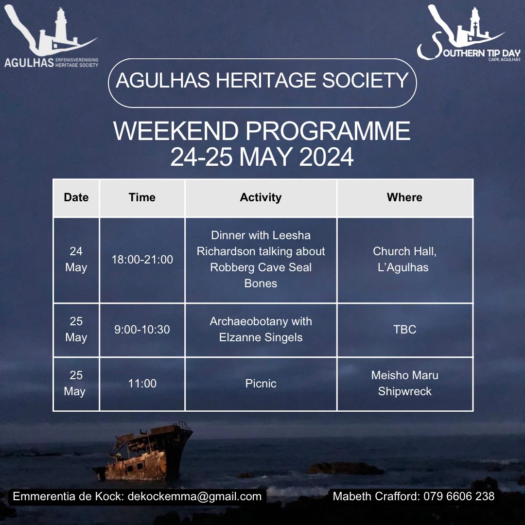 The Agulhas Heritage Society is hosting their Southern Tip Day Weekend Programme of events from 24-25 May 2024. Below is their programme: