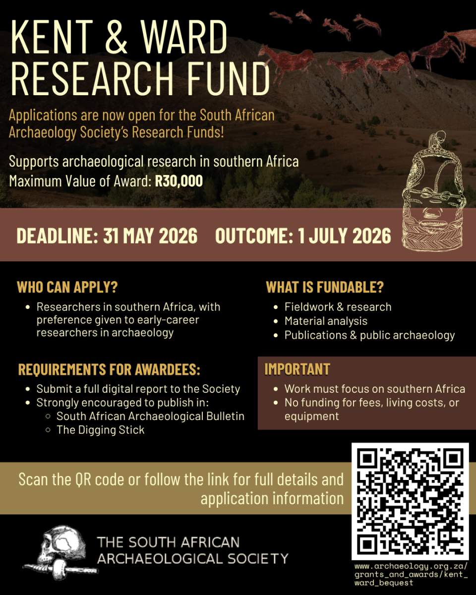 -Successful applicants must provide a digital copy of a full report on the work completed to the Council of the Archaeological Society. Council also strongly encourages the publication of research in the South African Archaeological Bulletin or The Digging Stick.